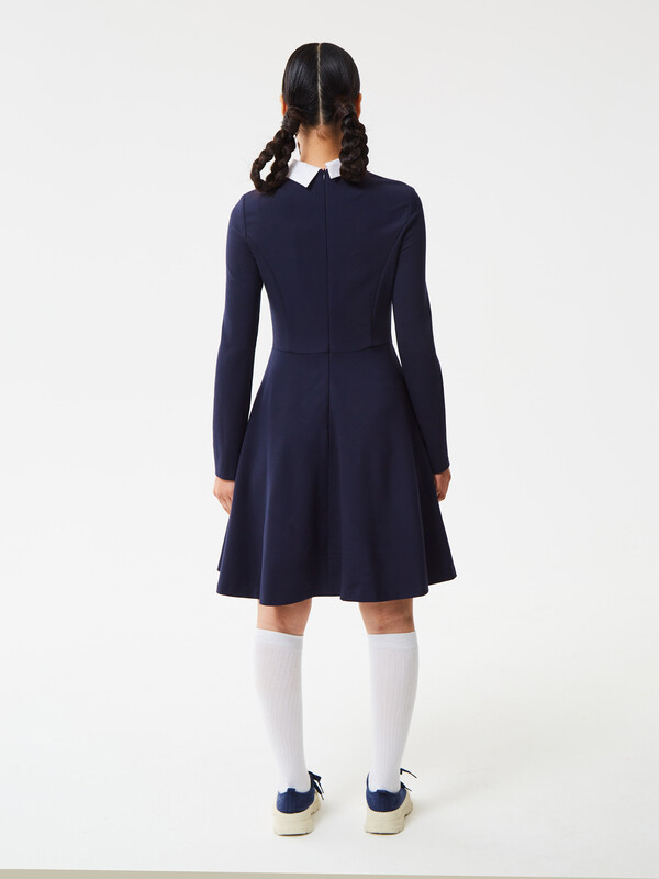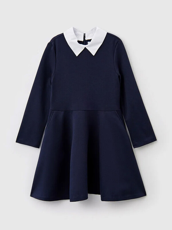 Трикотажное платье А-образного силуэта с длинными рукавами, отрезное по линии талии. Платье дополнено съемным отложным воротником контрастного белого цвета, что обеспечивает не только удобство в уходе, но и возможность разнообразить ежедневный образ. На переднем полотнище юбки расположены боковые карманы. Застежка на потайную молнию на спинке не нарушает конструкцию и обеспечивает идеальную посадку.