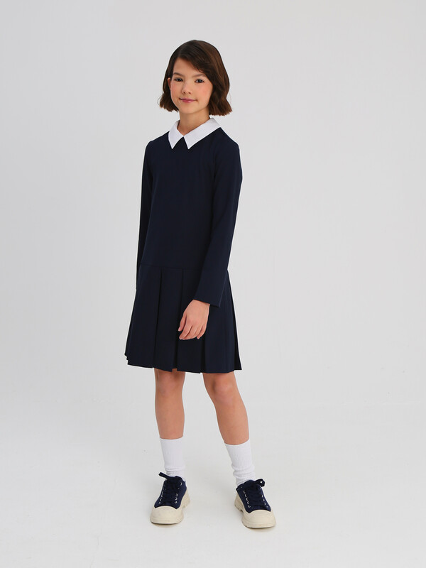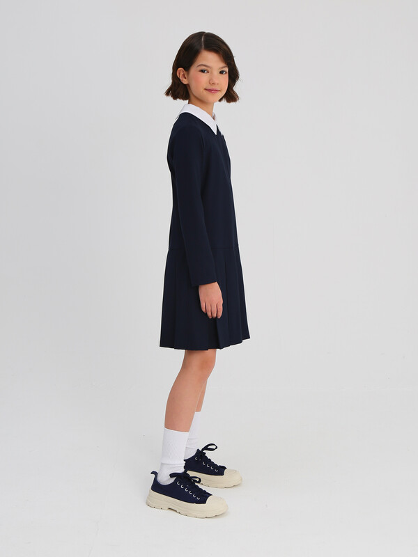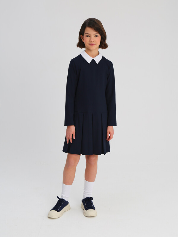 Стильное элегантное платье с заниженной линией талии. Дополнено съемным отложным воротником контрастного белого цвета, что обеспечивает не только удобство в уходе, но и возможность разнообразить ежедневный образ. Юбка в широкую складку. Застежка на потайную молнию на спинке не нарушает конструкцию и обеспечивает идеальную посадку.