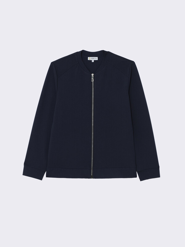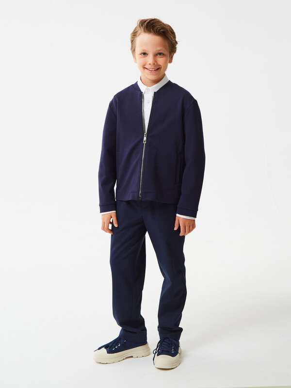 Классический трикотажный бомбер для мальчика из смесовой вискозы свободного силуэта с воротником-стойкой и длинным втачным рукавом. Дополнен карманами в боковых швах. Манжеты на рукавах и низ бомбера оформлены резинкой. Застёгивается на металлическую молнию.