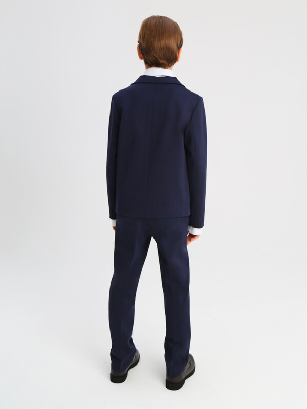 Классический костюм 2-йка для мальчика из трикотажа. Пиджак полуприлегающего силуэта с английским воротником и длинными втачными рукавами. Дополнен прорезными карманами с клапаном. Застегивается на 2 пуговицы. Брюки зауженные на поясе с еврорезинкой сзади. В боковых швах расположены карманы, горизонтальные защипы и застёжка - гульфик на молнии. Сзади расположены карманы с листочкой.