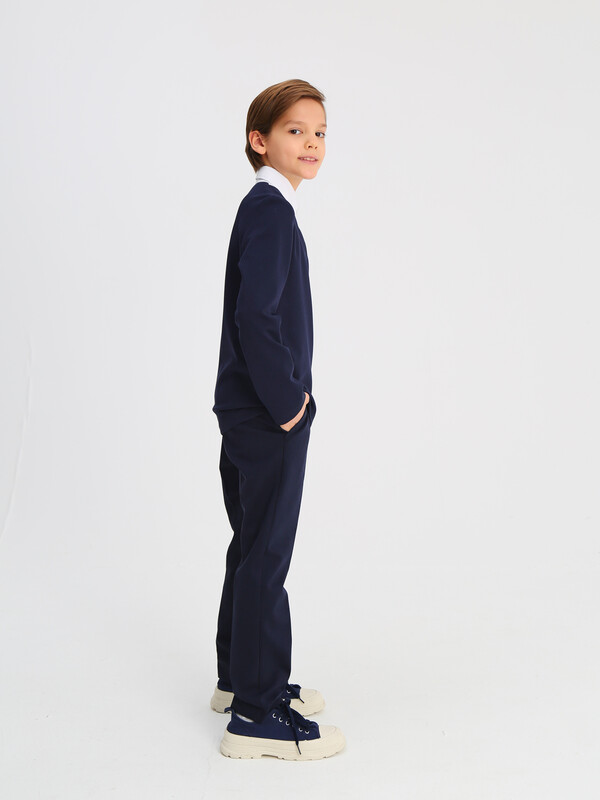 Джемпер трикотажный для мальчика прилегающего силуэта с имитацией манишки из сорочечной ткани контрастного цвета. Воротник отложной со стойкой. Укороченная застёжка на переде на планку с пуговицами. Рукава втачные длинные. Отличный вариант на каждый день.