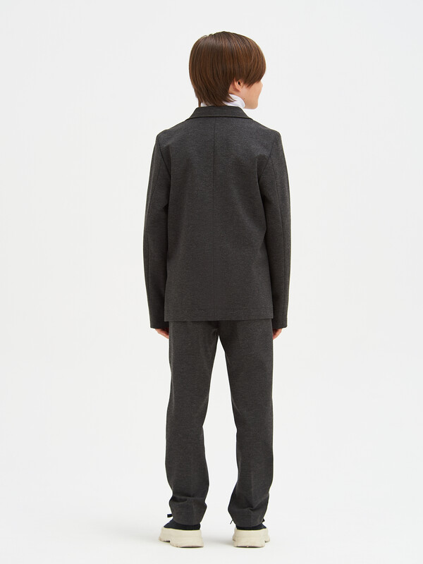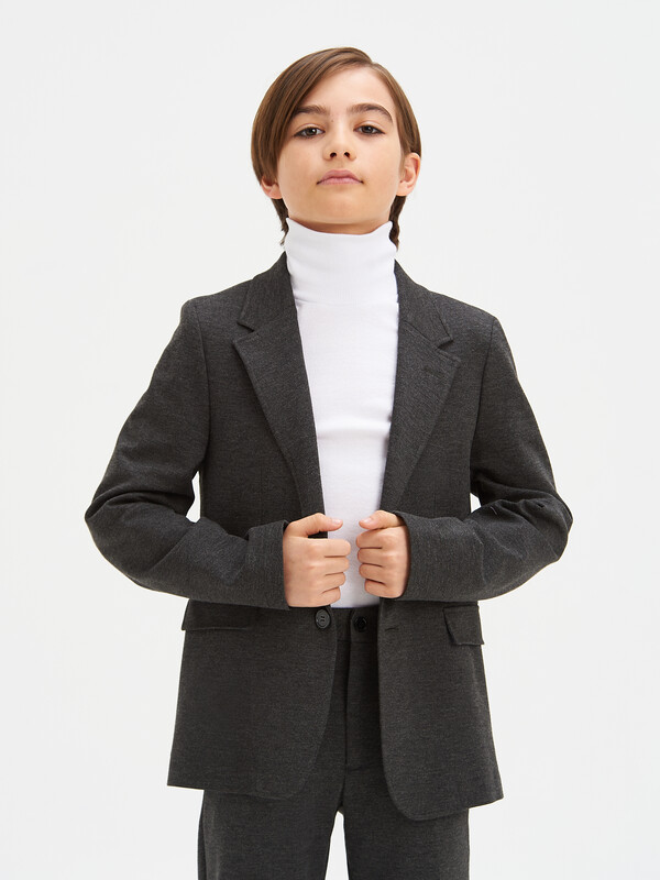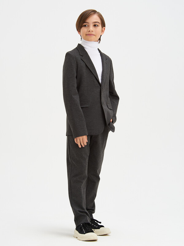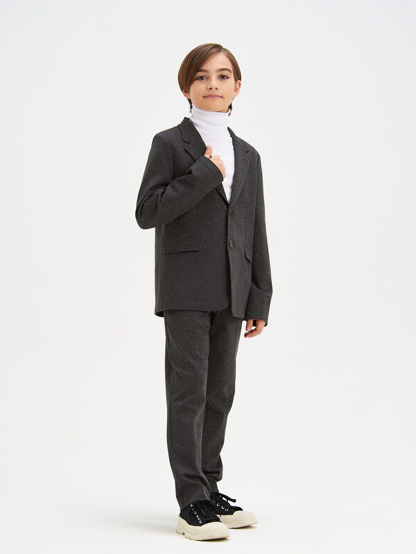 Классический костюм 2-йка для мальчика из трикотажа. Пиджак полуприлегающего силуэта с английским воротником и длинными втачными рукавами. Дополнен прорезными карманами с клапаном. Застегивается на 2 пуговицы. Брюки зауженные на поясе с еврорезинкой сзади. В боковых швах расположены карманы, горизонтальные защипы и застёжка - гульфик на молнии. Сзади расположены карманы с листочкой.