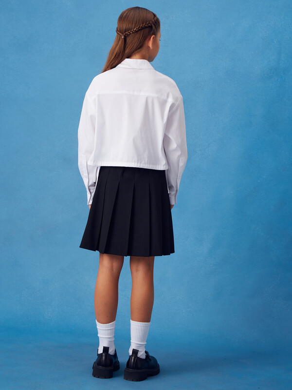 Укороченная блузка свободного силуэта для подростков из смесового хлопка с отложным воротником-стойкой и длинными рукавами на манжетах. Слева расположен функциональный накладной карман. Застежка на планку с пуговицами. Высокое содержание хлопка в составе обеспечивает отличную воздухопроницаемость и комфорт в повседневной носке. Оформление нижнего края завязками придает блузке модную форму. "