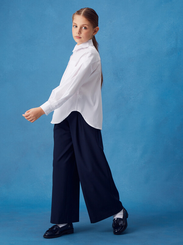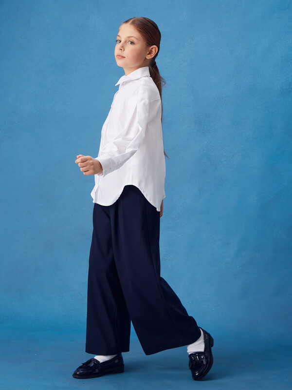 Классическая блузка для девочки из смесового хлопка с отложным воротником со стойкой, длинными спущенными рукавами на манжетах и кокеткой на спинке. Высокое содержание хлопка в составе обеспечивает отличную воздухопроницаемость и комфорт в повседневной носке. "