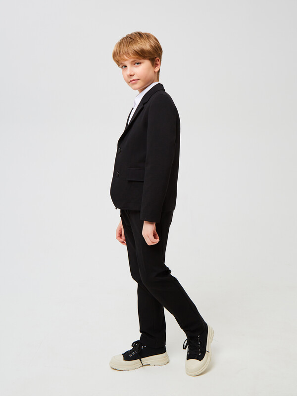 Классический костюм 2-йка для мальчика из трикотажа. Пиджак полуприлегающего силуэта с английским воротником и длинными втачными рукавами. Дополнен прорезными карманами с клапаном. Застегивается на 2 пуговицы. Брюки зауженные на поясе с еврорезинкой сзади. В боковых швах расположены карманы, горизонтальные защипы и застёжка - гульфик на молнии. Сзади расположены карманы с листочкой.