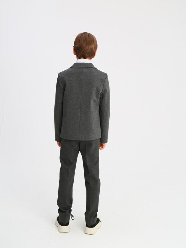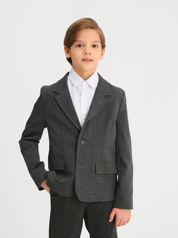 Трикотажный пиджак из смесовой вискозы полуприлегающего силуэта с английским воротником и втачным рукавом. Имитация боковых карманов с клапаном. Застегивается на 2 пуговицы.