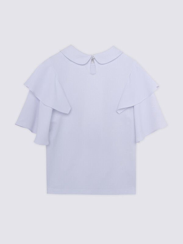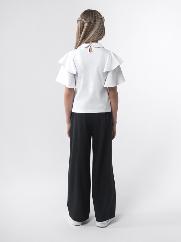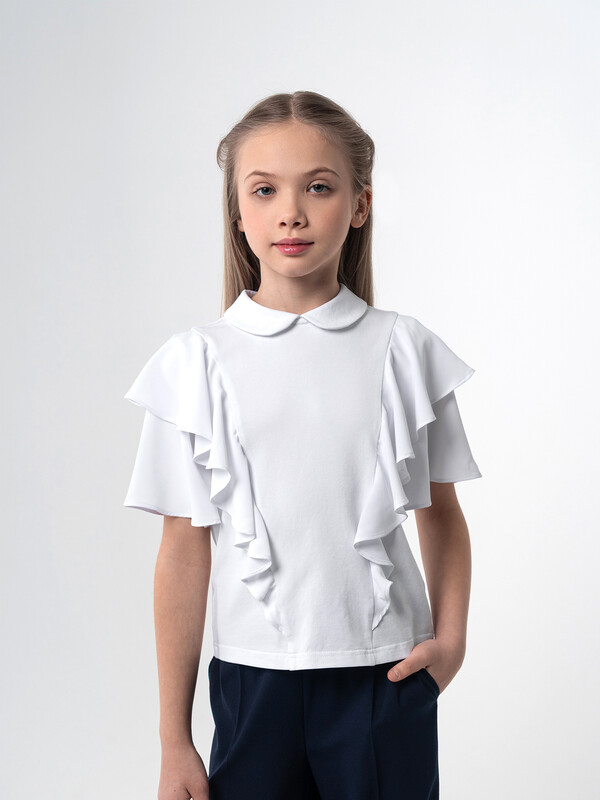 Нарядный трикотажный джемпер для девочек идеально подойдет для школы и особых случаев. Модель выполнена из мягкого трикотажного полотна, обеспечивающего комфорт и удобство в течение всего дня. Особенность изделия заключается в оригинальном дизайне: передняя полочка украшена воланами из шифона, что добавляет образу легкость и изысканность. Рукава короткие, расклешенные к низу, сшиты из воздушного шифона, подчеркивают утонченность модели.