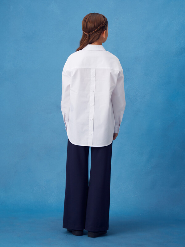Недостающий пазл в гардеробе девочки — свободная белая блузка оверсайз силуэта! Блузка выполнена из смесового хлопка. Высококачественный материал прекрасно дышит, держит форму и идеально подходит для образов на каждый день. Блузку с удлиненной линией можно сочетать с зауженными или прилегающими брюками, носить как самостоятельный элемент или надевать поверх базовых футболок, чтобы создать более расслабленный и непринужденный комплект. Блузка застёгивается на пуговицы. Модель дополнена декаоративным элементом на спике в виде планки с пуговицами. "