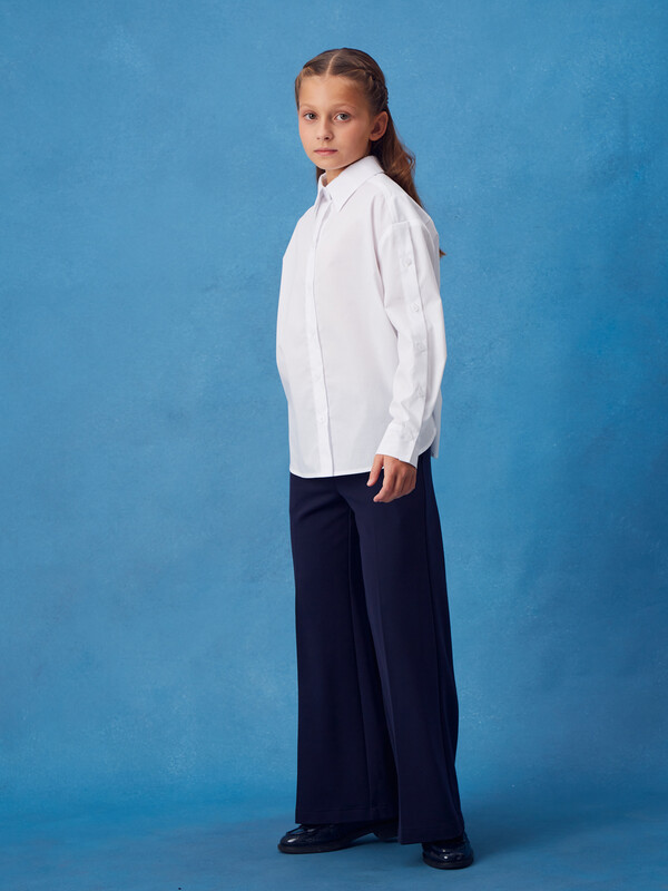 Недостающий пазл в гардеробе девочки — свободная белая блузка! Она выполнена из смесового хлопка. Высококачественный материал прекрасно дышит, держит форму и идеально подходит для образов на каждый день. Блузка застёгивается на пуговицы. Модель дополнена декоративным элементом на рукавах в виде планок с пуговицами. "