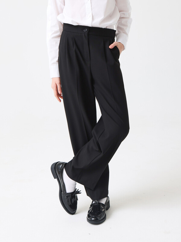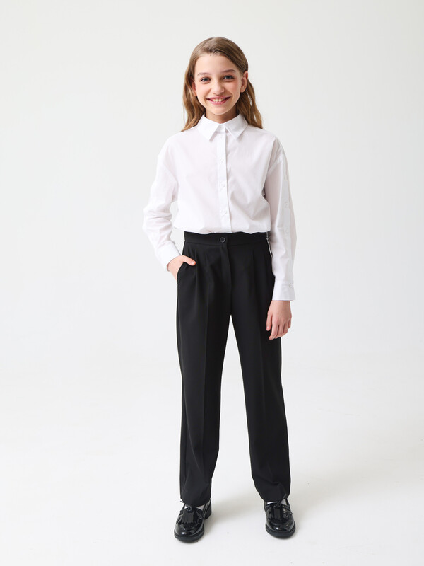 Прямые брюки со стрелками для девочек изготовлены из немнущейся костюмной ткани высокого качества, которая идеально подходит для брюк данного фасона. Высокая талия и пояс на резинке не стесняют движений. Застежка на молнии, петлю и пуговицу на поясе.Брюки имеют карманы достаточной глубины. Брюки элегантно смотрятся на девочках любого роста.