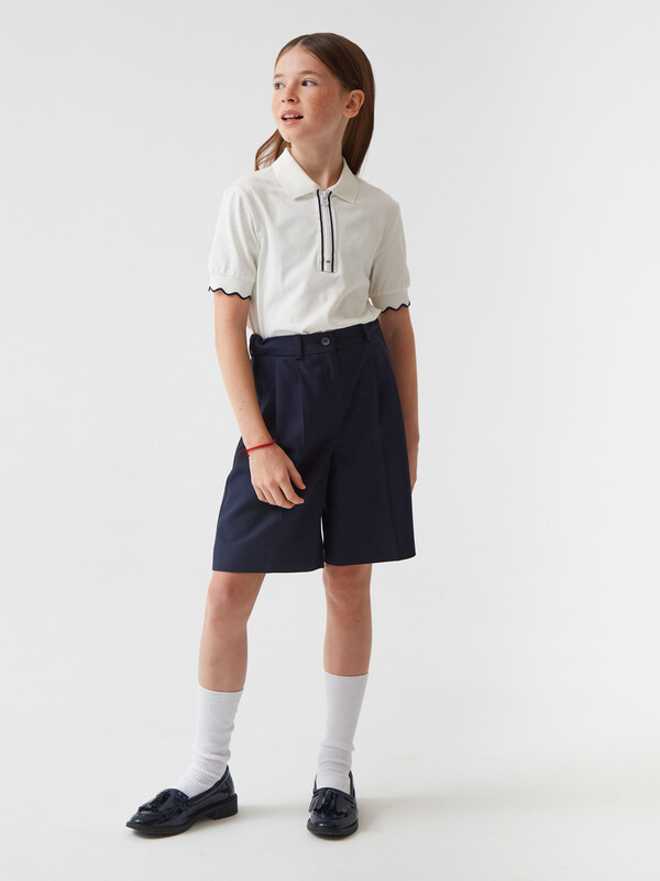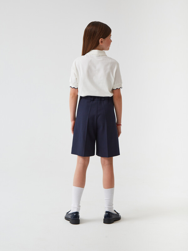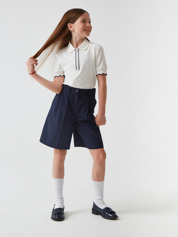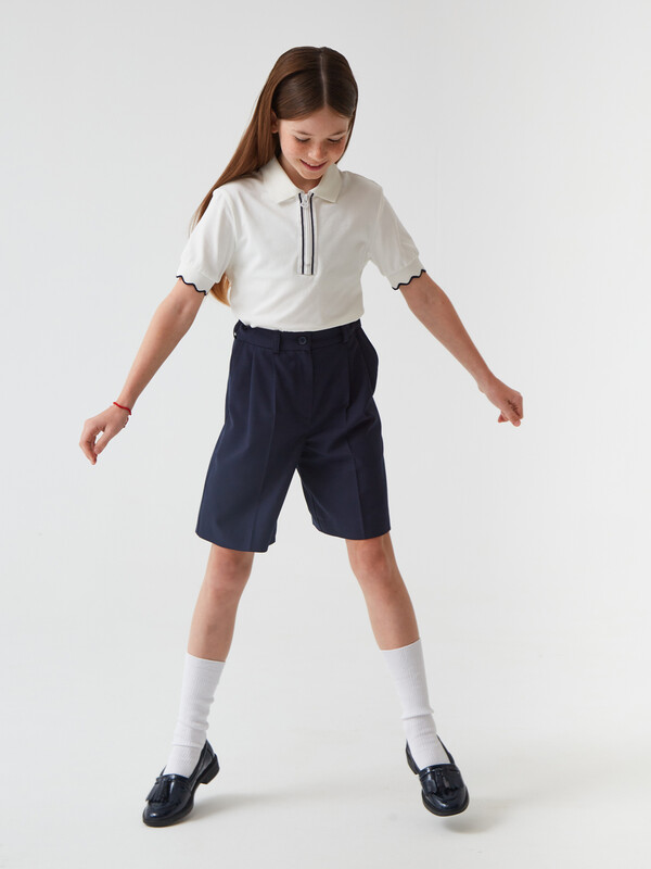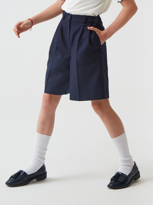 Шорты со стрелками без подкладки для девочек изготовлены из немнущейся костюмной ткани высокого качества. В задней части пояса вложена евро-резинка, регулируемая пуговицами. Шорты имеют боковые карманы достаточной глубины. Шорты элегантно смотрятся на девочках любого роста.
