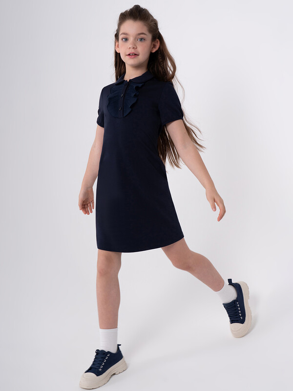 Трикотажное платье с короткими рукавами отлично подходит для школы. Оно выполнено без подкладки, что обеспечивает комфорт в течение всего дня. Застегивается на пуговицы расположенные на притачной планке, украшенной кружевом.