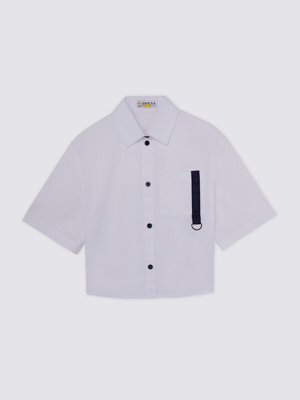 Укороченная блузка свободного силуэта для подростков из смесового хлопка с отложным воротником со стойкой и короткими свободными рукавами. На полочке расположен накладной карман с декоративным элементом. Застежка на планку с пуговицами. Высокое содержание хлопка в составе обеспечивает отличную воздухопроницаемость и комфорт в повседневной носке. "