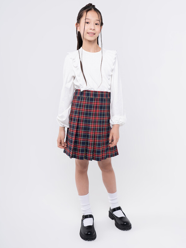 Плиссированная юбка для девочки идеально подходит для школы. Она выполнена с застежкой в левом боковом шве, где аккуратно расположены молния и пуговица, что обеспечивает надежную фиксацию. Плиссированное полотно создает элегантный вид, добавляя изюминку в школьный наряд. Пояс юбки притачной, что гарантирует комфорт и хорошую посадку. Внутри пояса на участке заднего полотнища находится евро-резинка, которая легко регулируется с помощью пуговицы, пришитой на внутренней стороне. Это позволяет создавать индивидуальный fit для каждой девочки.