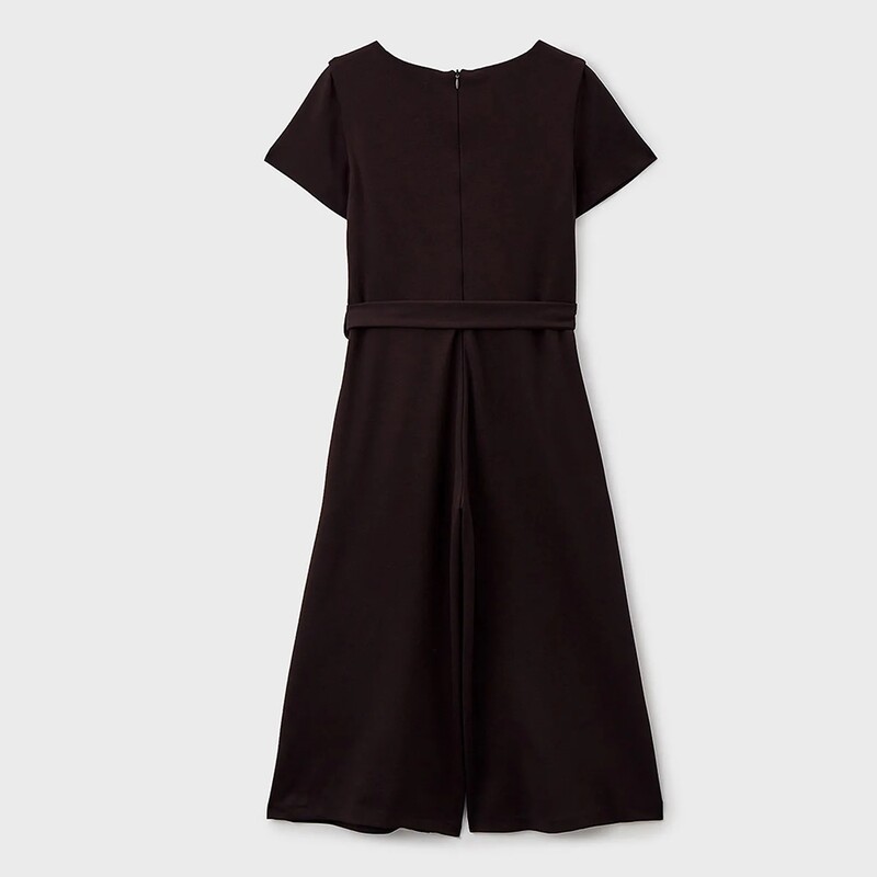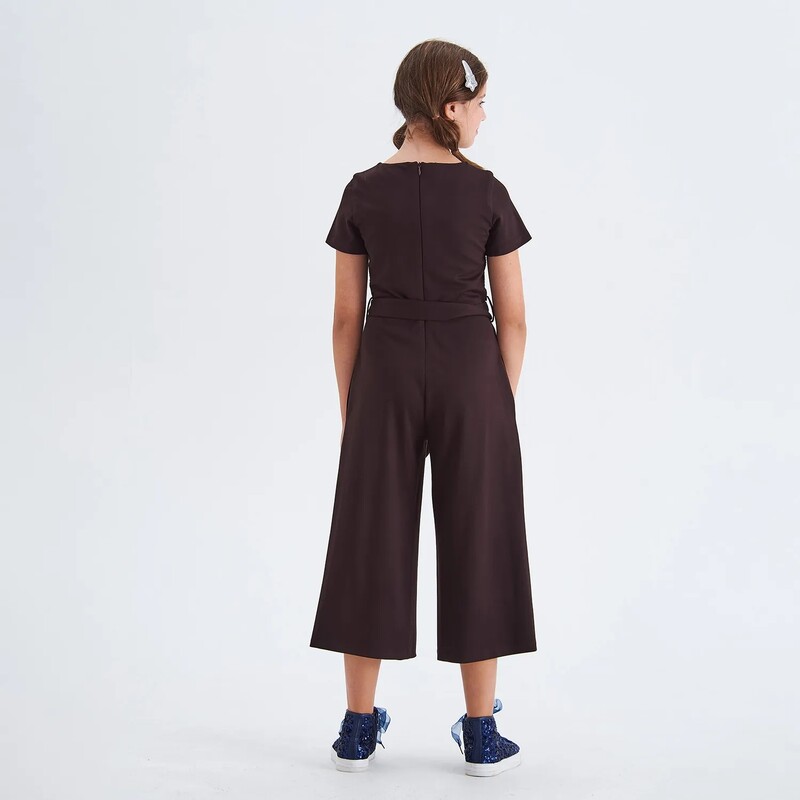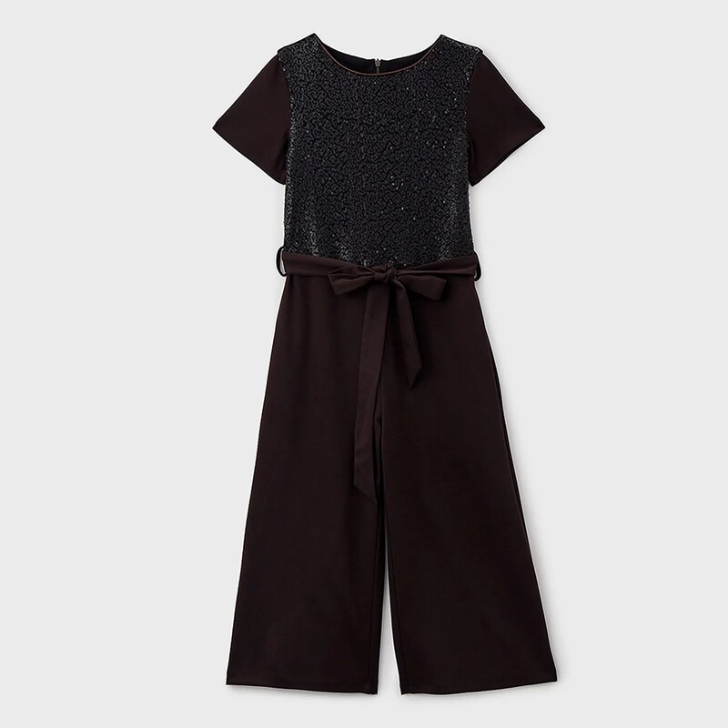 Комбинезон из трикотажного полотна с короткими рукавами, с отделкой пайетками на полочке. Брюки широкие прямые с боковыми карманами. Застежка по спинке на потайную молнию. Подкладка на полочке из хлопка.