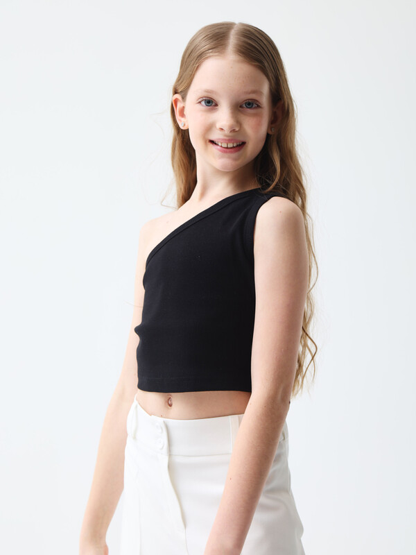 Асимметричный укороченный базовый топ в рубчик. Мягкий трикотаж из смесового хлопка. Размерный ряд 128 – 176 см.
