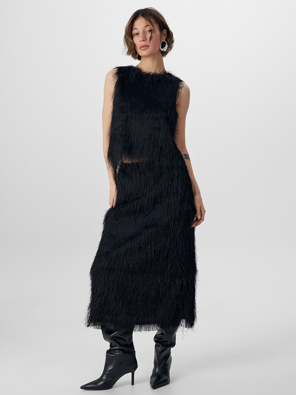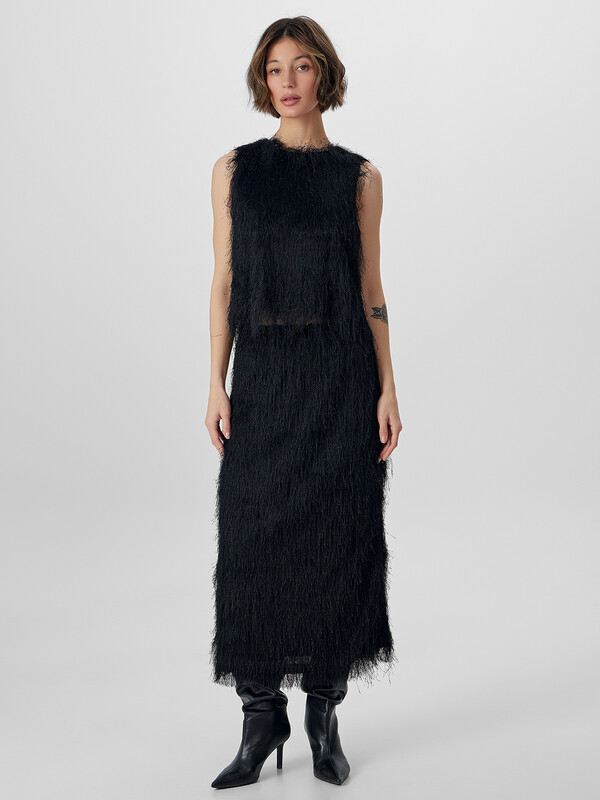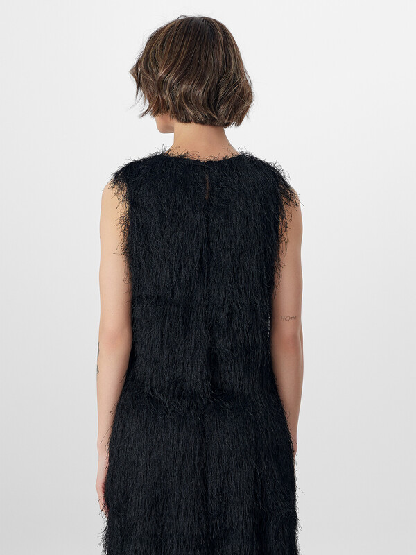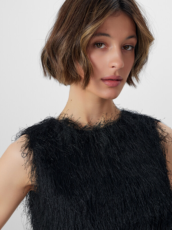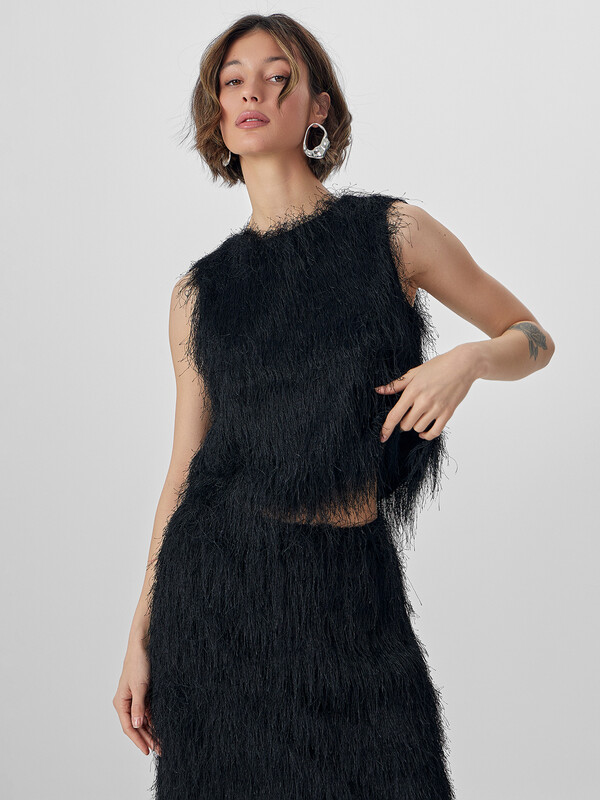 Блузка с нежным ворсом без рукавов станет эффектным элементом вашего праздничного образа. Укороченный крой, декоративная бахрома и фактурная отделка придают модели особый шарм и индивидуальность.