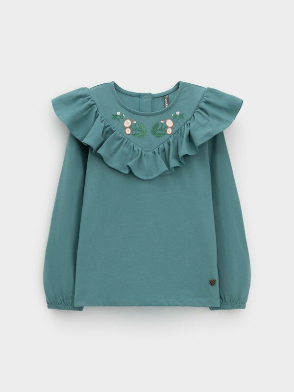 Блузка с воланом для девочки. Изготовлена из высококачественного трикотажного полотна и украшена вышивкой на груди. Блузка сохраняет форму и стойкий цвет после многочисленных стирок и идеально подходит на каждый день. Все трикотажные полотна производятся в соответствии с нормами швейцарского сертификата ЭкоТекс.