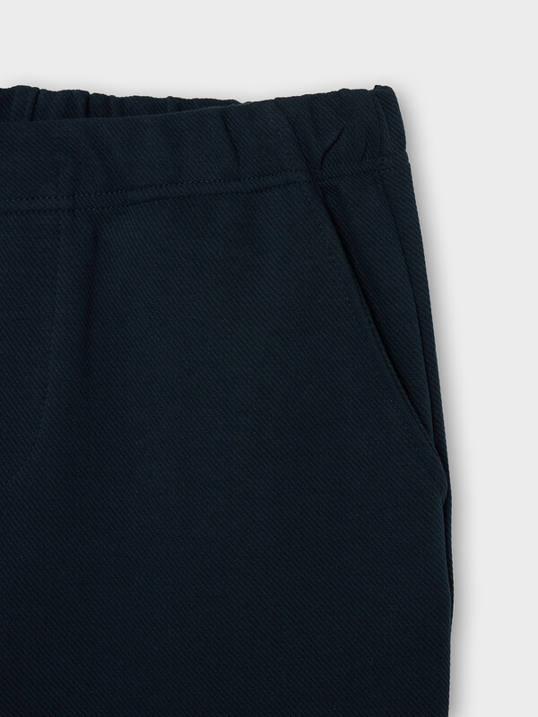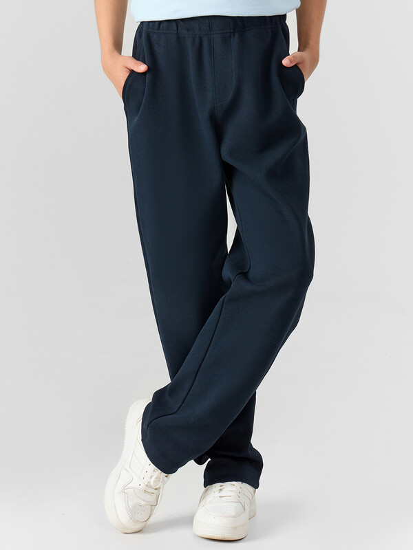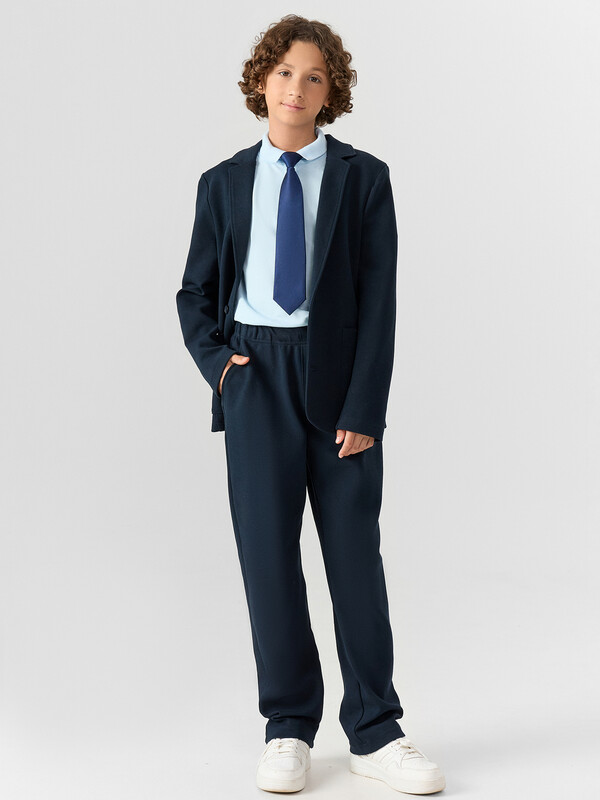Брюки для мальчиков, прямого силуэта. Пояс цельнокроеный с втачной эластичной тесьмой. По переду обработаны карманы «хулиганы». На передней левой детали проложены отделочные строчки - имитация гульфика. Низ брюк обработан швом в подгибку на двухигольной плоскошовной машине.