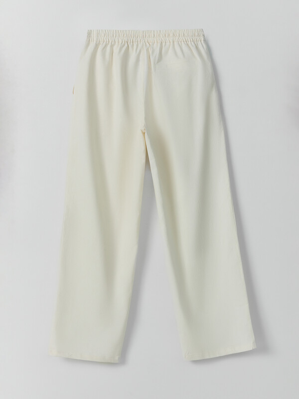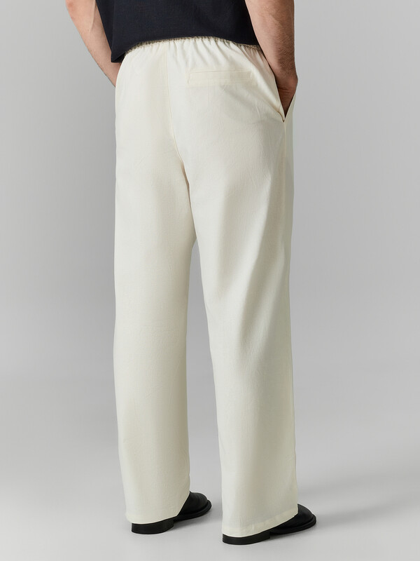 На задней половинке брюк справа прорезной карман-обманка с листочкой.