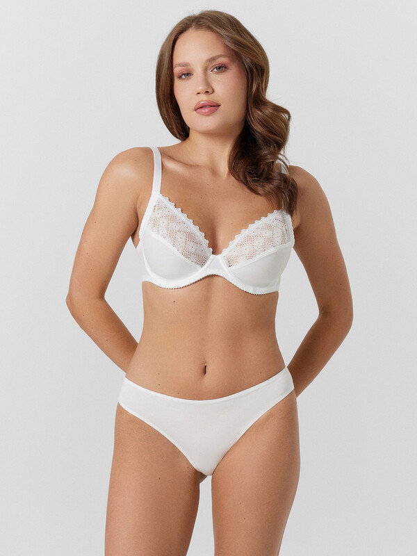 Чашка с тройным членением из трикотажного неэластичного полотна арт 440 (гладкий), с отделкой эластичным кружевом. Срезы рельефов с изнаночной стороны обработаны бейкой из монокапрона. По верхнему срезу кружева с изнаночной стороны настрочена эл тесьма 6 мм (жилка тканая Wt4-6, девсел 13460 W).