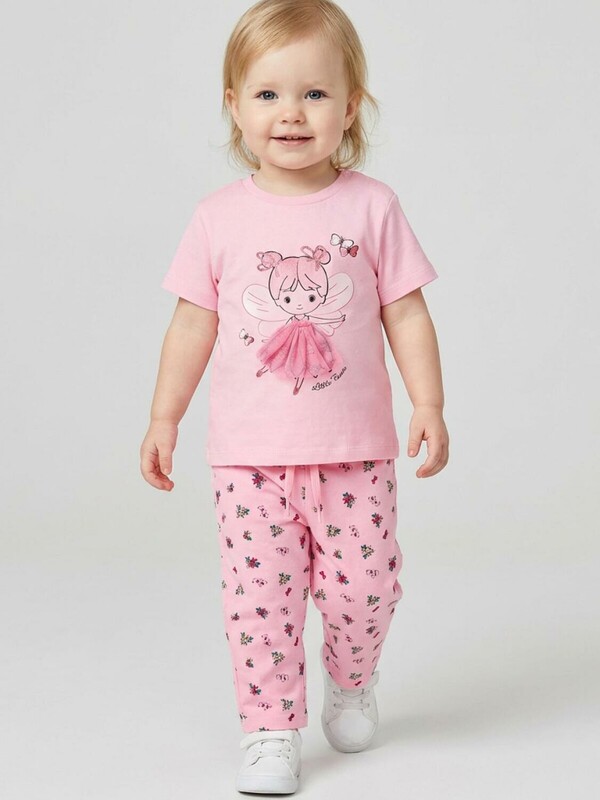 Детская футболка для девочки. Модель прямого кроя, выполнена из эластичного хлопкового трикотажа джерси. Спереди - крупный принт с феей. Юбка у феи и декоративный бантик на спинке выполнены из сетки. Горловина круглая. На плече застежка на кнопки для удобного переодевания.