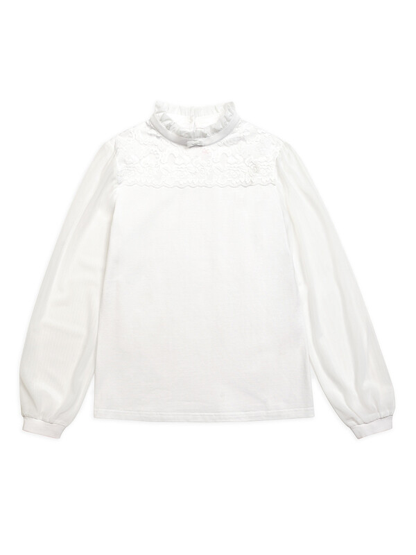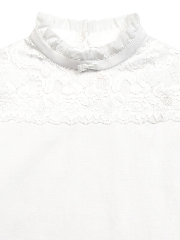 По верху переда настрочено широкое кружево, создающее эффект кокетки — утончённый элемент, который делает блузку нарядной, оставаясь в рамках школьной формы.
