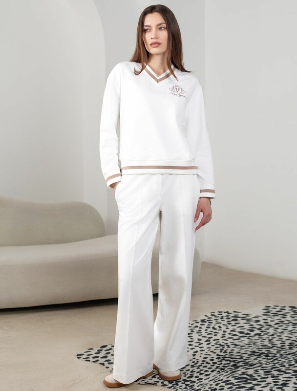 Перевод принта: Теннисный клуб. Джемпер умеренного объема с V-вырезом выполнен из эластичного футера двухнитки. Горловина, манжеты и пояс выполнены из эластичного хлопка с контрастной полосой. Изделие дополнено золотистым логотипом бренда. Сочетается в костюме с брюками D44.141, D44.142, шортами D48.009 и юбкой-шортами D46.041