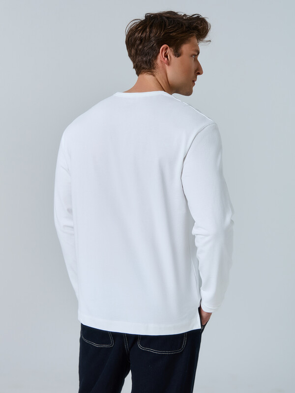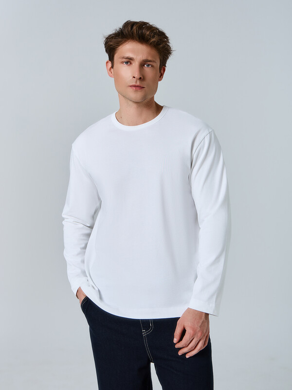 Джемпер изготовлен из трикотажного полотна кулирка. Джемпер прямого силуэта, длиной до линии бедер. Горловина округлой формы окантована бейкой в 4 сложения из рибаны.