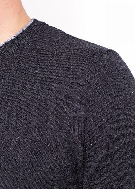 Мужской вязаный джемпер с V-образным вырезом горловины в базовом ассортименте. Целостность модели придают двойная контрастная горловина, декоративная полосатая тесьма и провязаная обтачка по спинке. Модель дополняет металлофурнитура по низу.