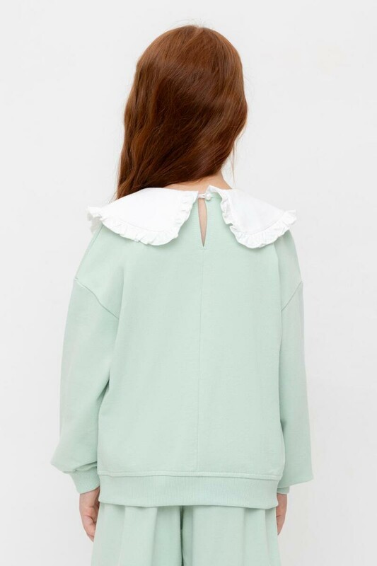 Свитшот с воротником для девочки из высококачественного трикотажафутера петли. Застёгивается на спинке с помощью пуговицы. Пояс и рукава выполнены из эластичного трикотажа. Изделие сохраняет цвет и форму после многократных стирок.
