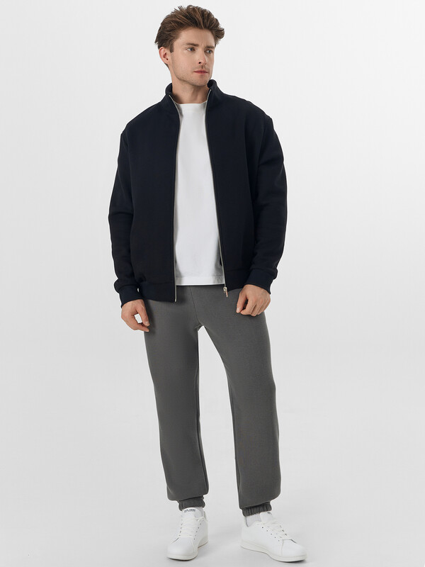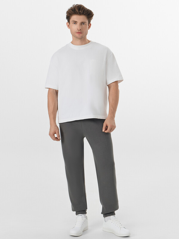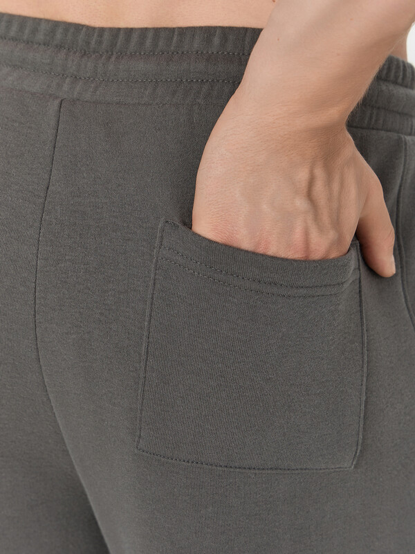 Джогеры прямые, зауженные к низу. Пояс отрезной с эластичной тесьмой внутри. С внутренней стороны пояса пробиты петли и втянут шнур с эглетами (8EКXWCp-1). В боковых швах обработаны карманы - хулиганы, подкладка карман из кулирки. На задней правой половинке накладной карман, по заданию. Нижние срезы брюк обработаны швом вподгибку с эластичной тесьмой внутри.