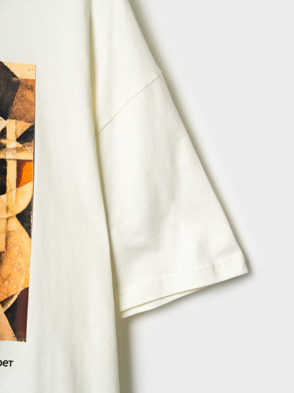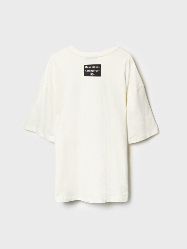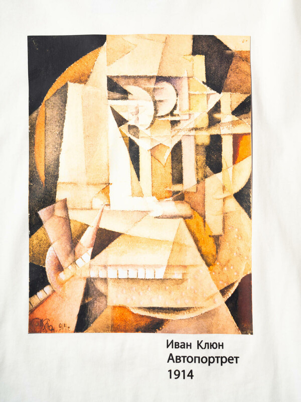Мужская футболка оверсайз. На груди размещён крупный цветной принт с репродукцией картины «Автопортрет» художника Ивана Клюна (1914 г.), а на спинке — небольшая подпись с его именем и названием картины. Горловина с круглым вырезом. Материал — мягкий хлопковый трикотаж джерси.