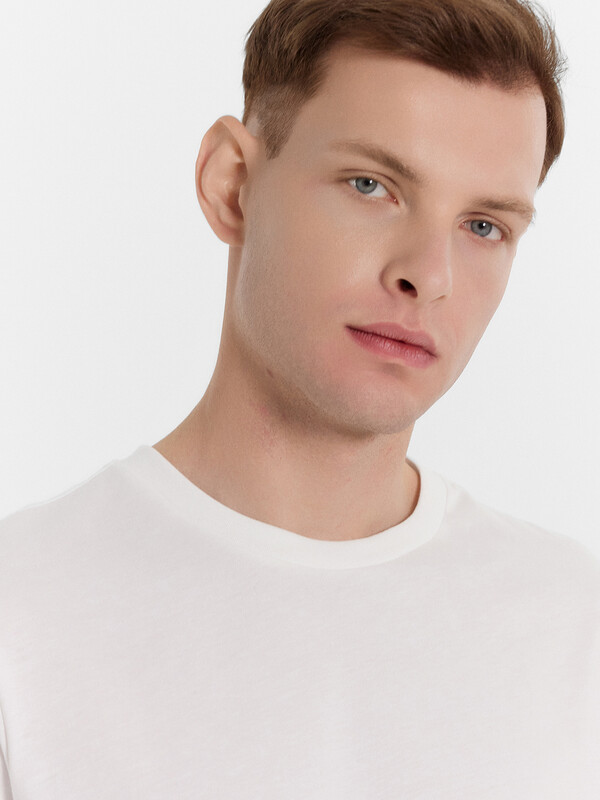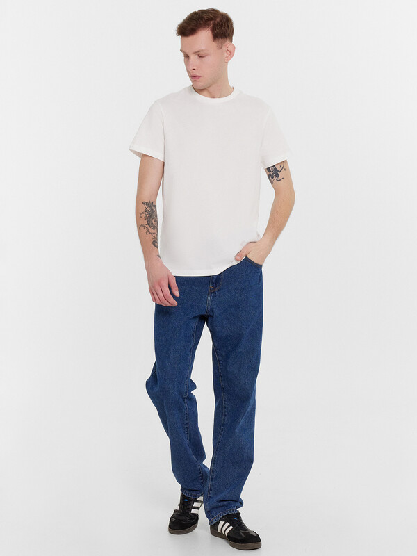 Мужская однотонная футболка из трикотажной кулирки. Силуэт прямой, расслабленный. Длина до середины бедер. Вырез классический, круглый. Рукава короткие. Актуальная футболка для стильный мужчин – универсально!