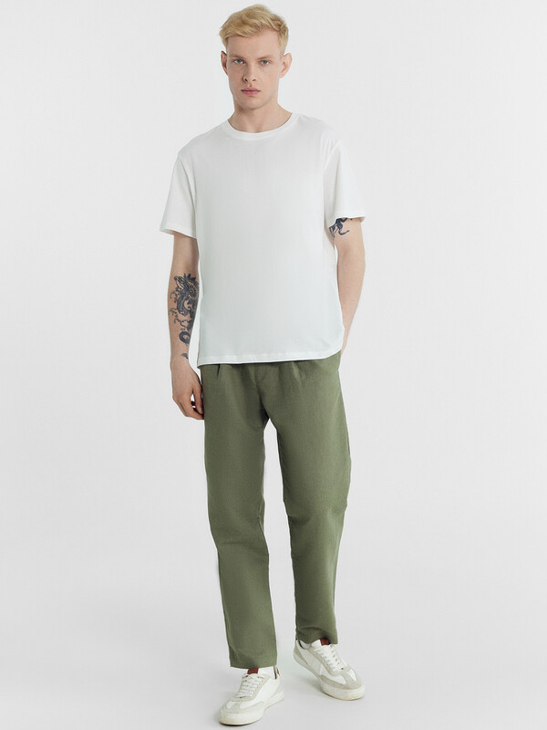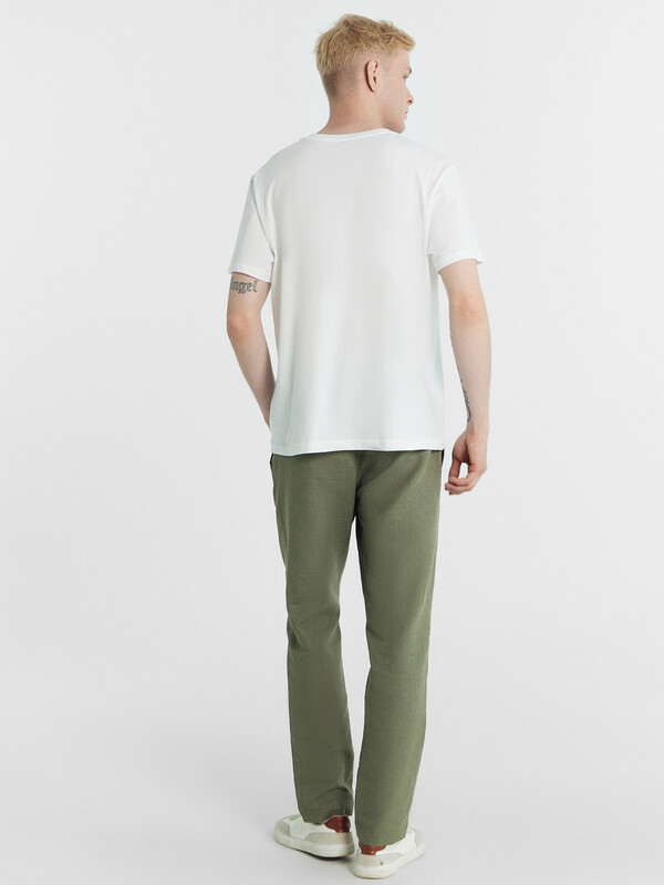 Футболка мужская свободного силуэта из трикотажного полотна кулирка. Горловина круглой формы, обтачка из рибаны. По горловине проложена отделочная строчка. Бейка по горловине спинки из кулирки. Рукав втачной, короткий.