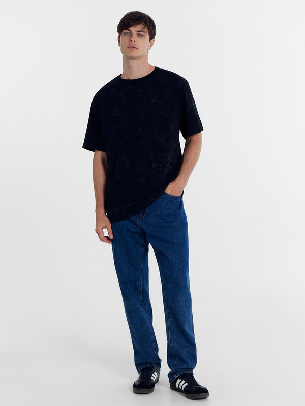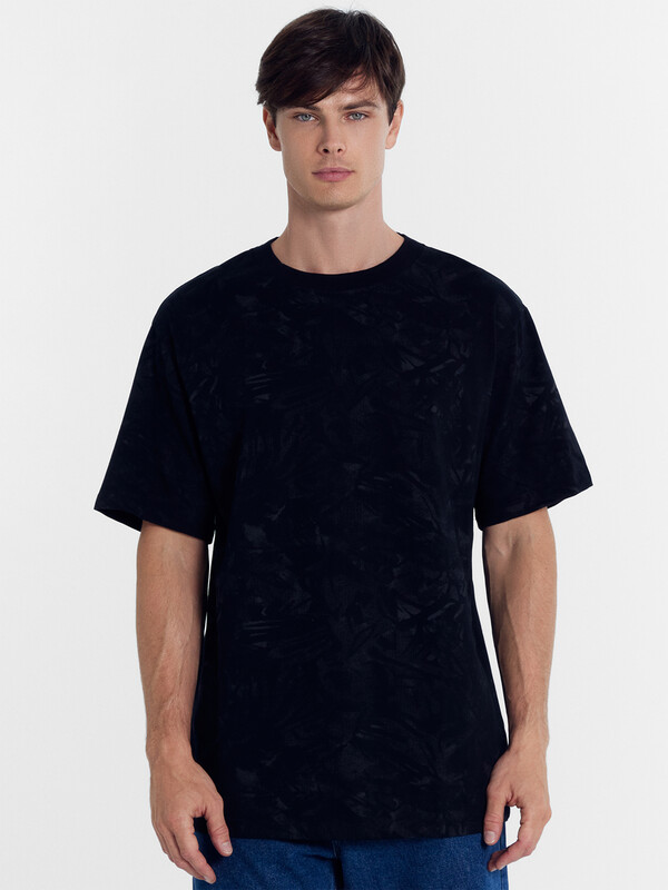 Нижние срезы футболки и рукавов обработаны швом в подгибку на