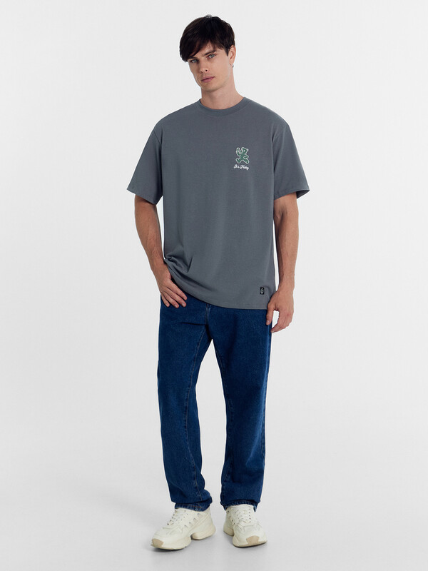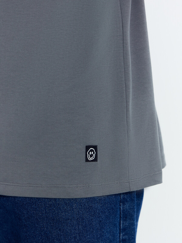 Нижние срезы футболки и рукавов обработаны швом в подгибку на