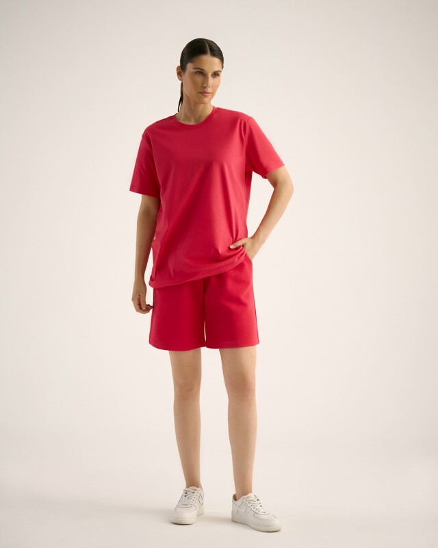 Boyfriend крой, укрепление по горловине спинки, круглый вырез. Горловина рибана. Отстрочка по горловине переда