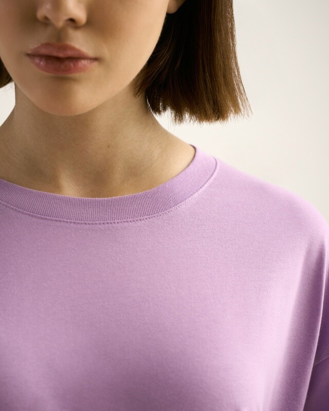 Укороченная футболка, спущенное плечо.Укрепление плечевых швов и шва горловины бейкой из основной ткани. Горловина из рибаны.