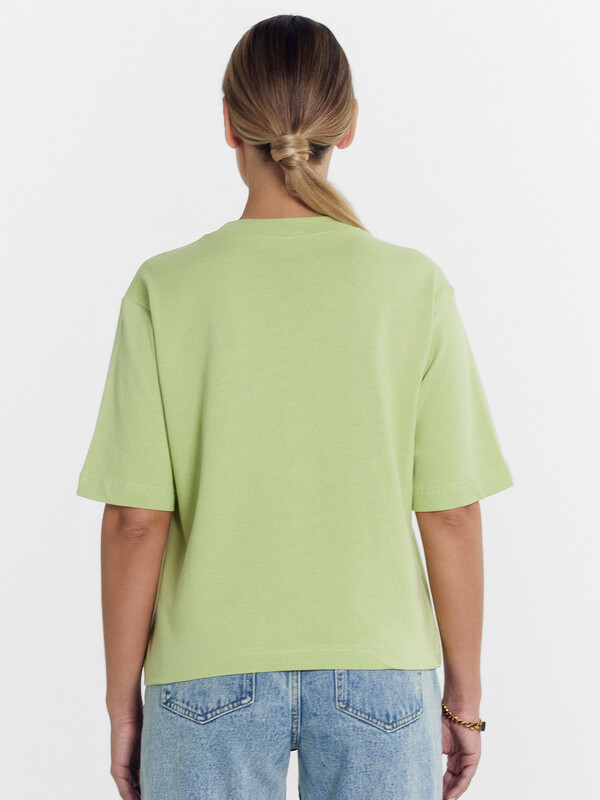 Нижние срезы футболки и рукавов обработаны швом вподгибку.