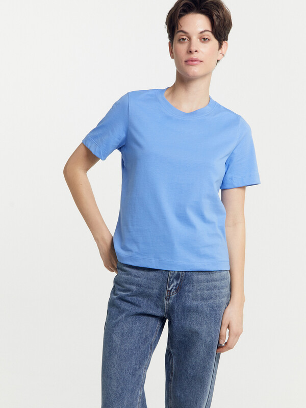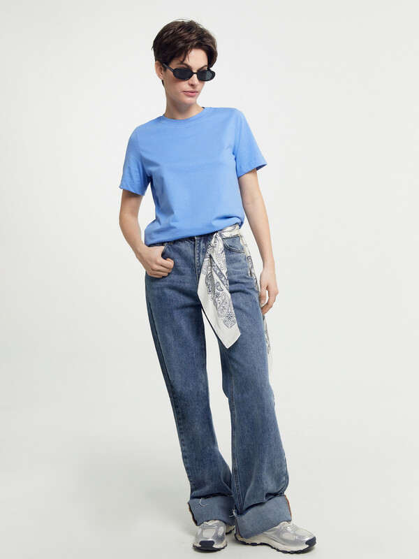 Футболка прямого силуэта из трикотажного полотна кулирка. Горловина круглой формы, широкая обтачка из рибаны.