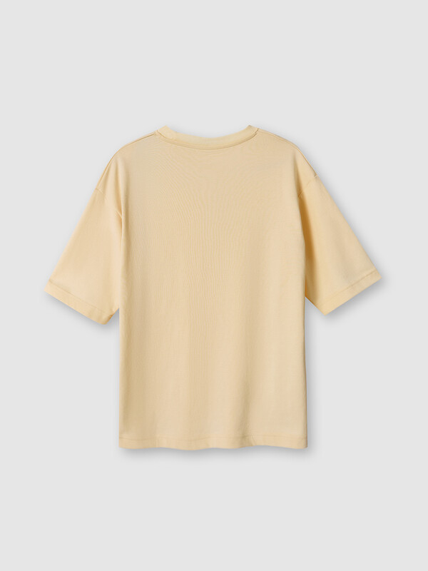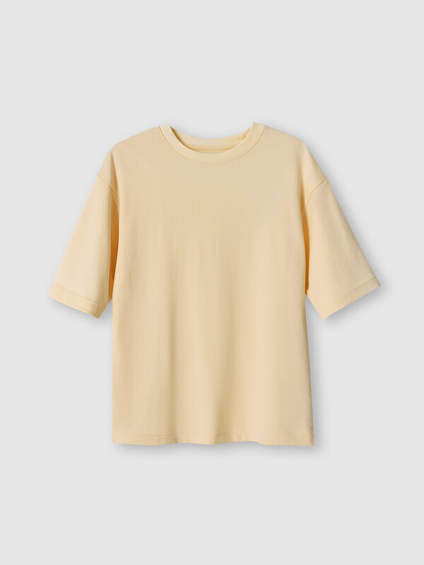 закрыт бейкой из основного полотна. Плечо спущено, пройма углублена. Рукав втачной, длиной по локоть. Подгибки низа футболки и рукавов широкие.