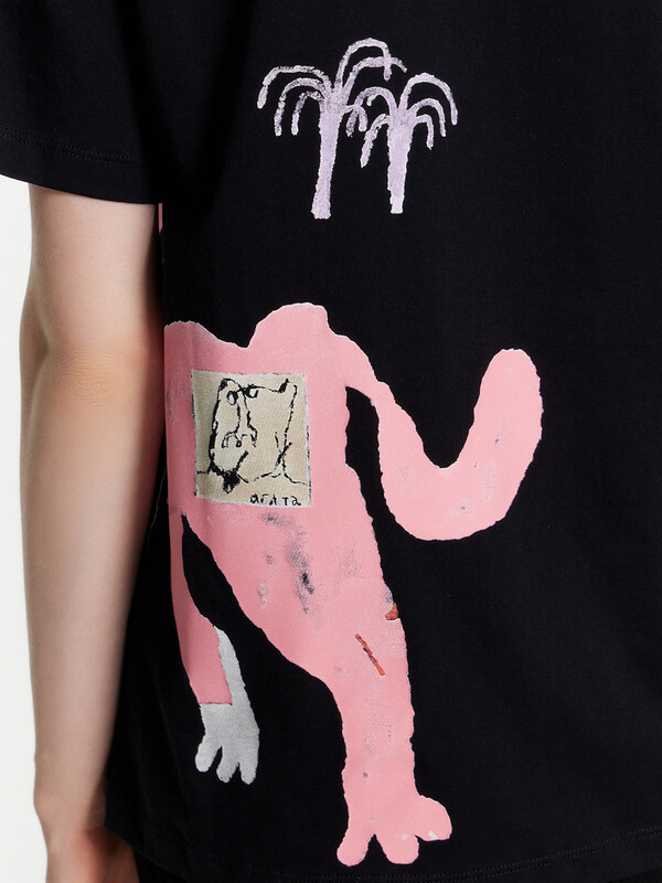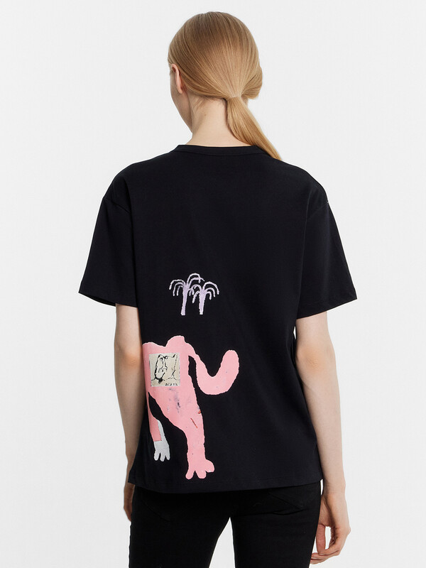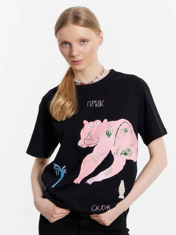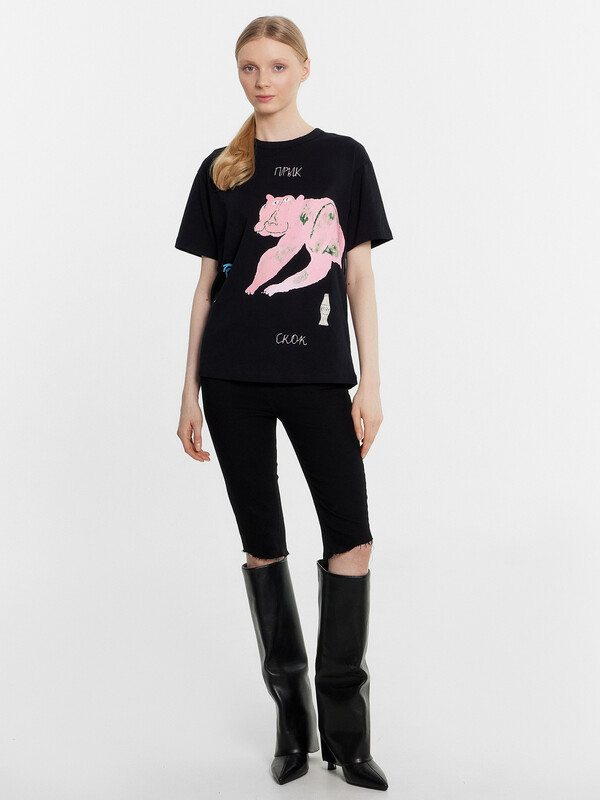Футболка прямая, свободная. Горловина круглой формы обработана бейкой в 3 сложения из основного полотна. Рукава втачные, корткие. Нижние срезы футболки и рукавов обработаны швом вподгибку.