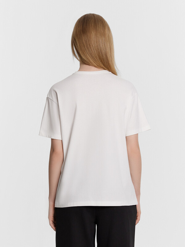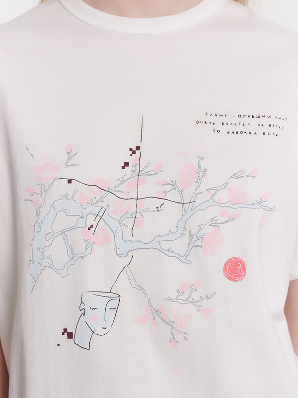 Футболка прямая, свободная. Горловина круглой формы обработана бейкой в 3 сложения из основного полотна. Рукава втачные, корткие. Нижние срезы футболки и рукавов обработаны швом вподгибку.