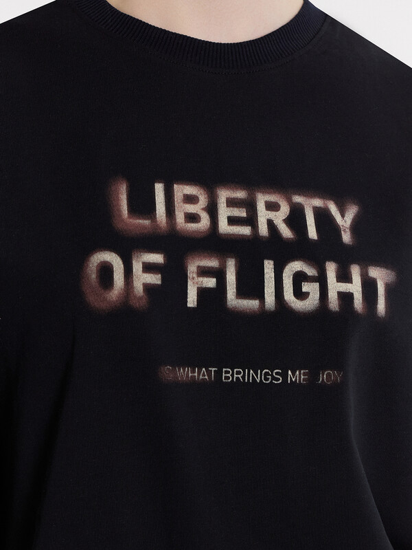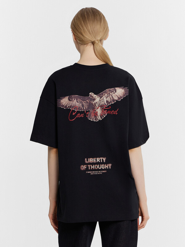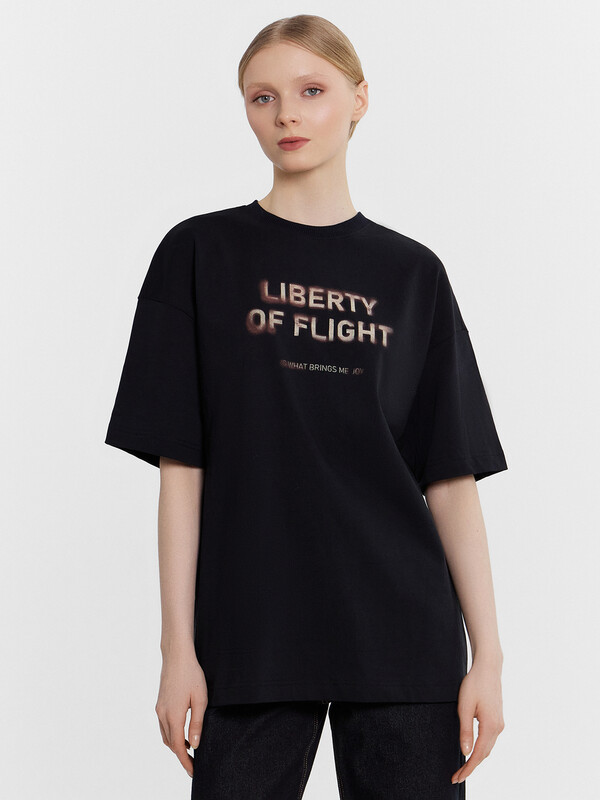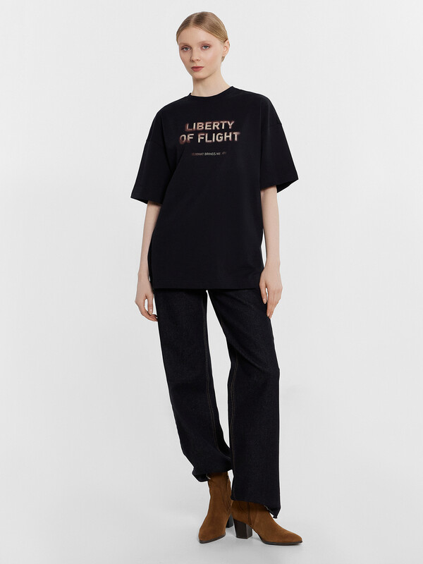 Футболка силуэта оверсайз из трикотажного полотна кулирка. Горловина круглой формы, обтачка горловины из рибаны. Шов горловины спинки закрыт бейкой из основного полотна.