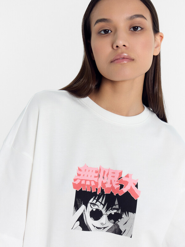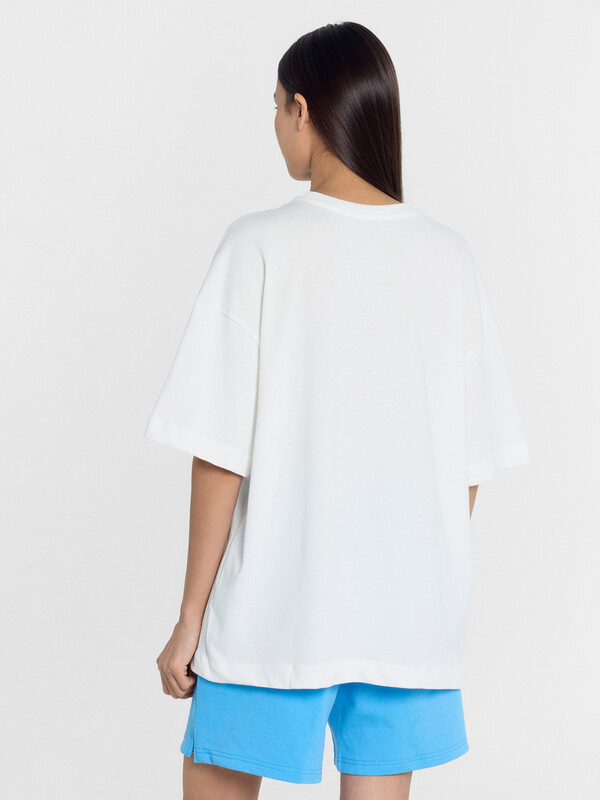 Футболка силуэта оверсайз из трикотажного полотна кулирка. Горловина круглой формы, обтачка горловины из рибаны. Шов горловины спинки закрыт бейкой из основного полотна.