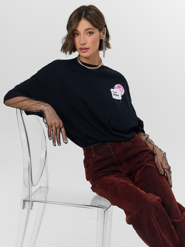 Удлиненный крой, свободная посадка и спущенная линия плеч создают расслабленный образ и подчеркивают актуальность модели. Широкие рукава длиной чуть выше локтя добавляют объема и свободы движений.