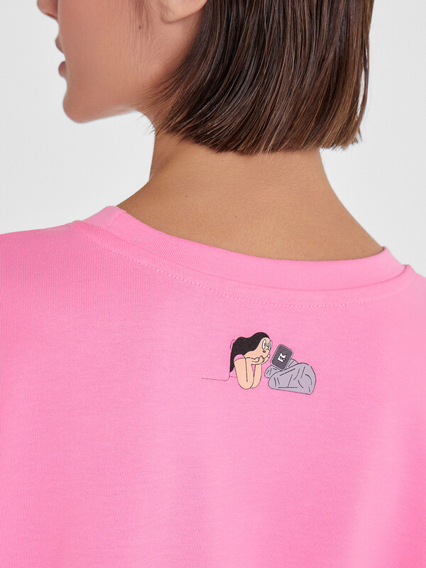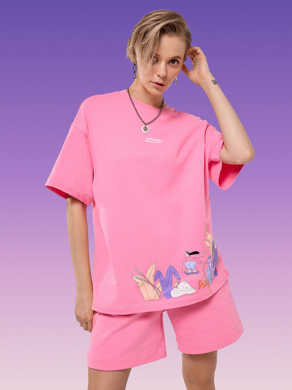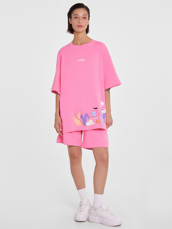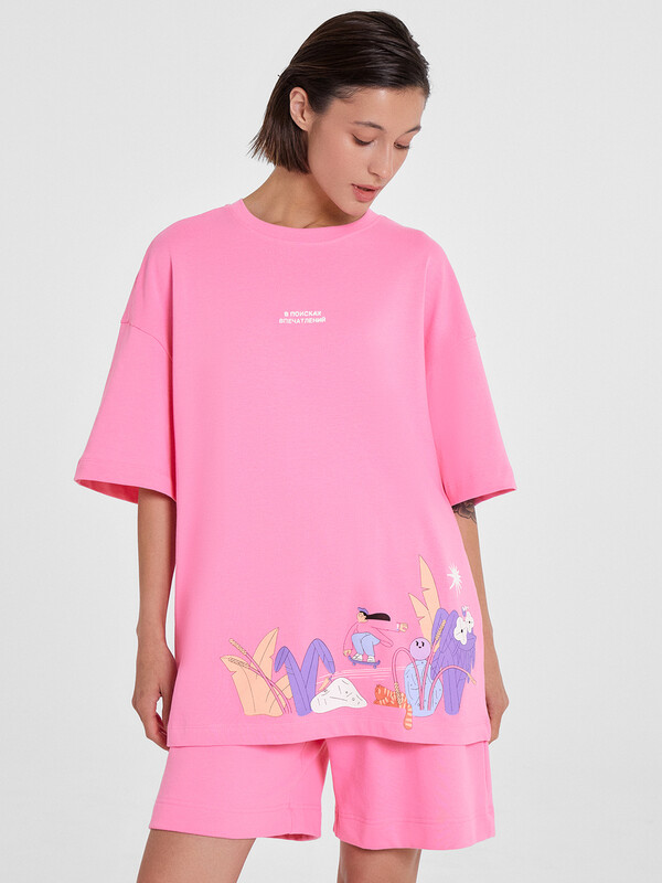 Футболка силуэта оверсайз из трикотажного полотна кулирка. Горловина круглой формы, обтачка горловины из рибаны. Шов горловины спинки закрыт бейкой из основного полотна.
