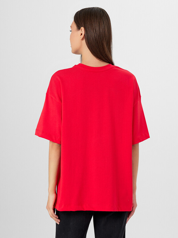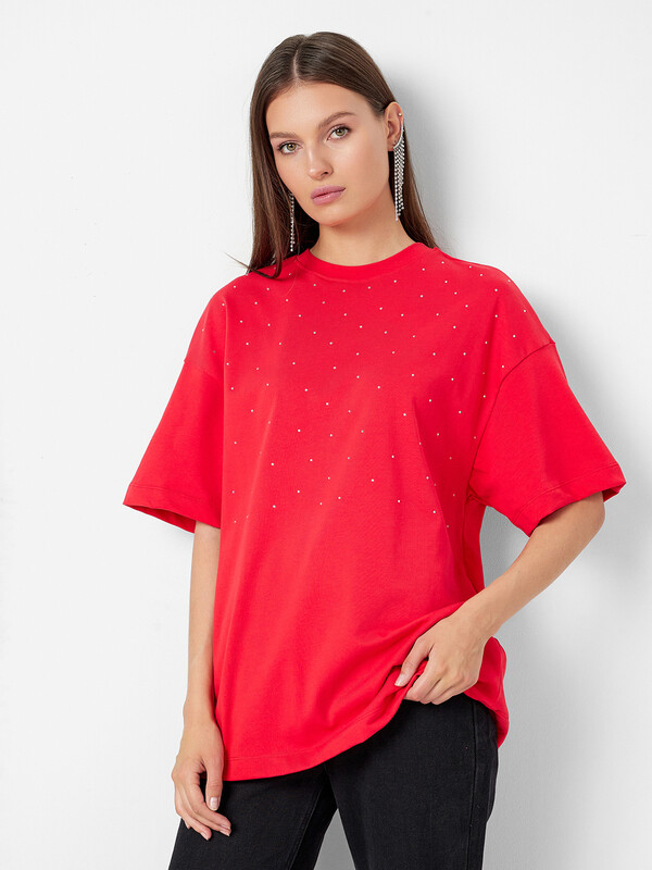 Эта женская футболка оверсайз со стразами станет ярким акцентом вашего гардероба. Выполненная из хлопковой кулирки, она сочетает в себе комфорт и стиль. Кулирка - это мягкий, прочный и воздухопроницаемый материал, отличающийся особой износостойкостью. Футболка имеет круглую горловину и спущенное плечо, а широкий рукав длиной чуть выше локтя добавляет модели стильный объем. Удлиненный силуэт делает эту модель идеальной для создания современных и удобных образов. Такой стильный и комфортный элемент одежды прекрасно подойдет для повседневной носки, добавляя блеска вашему образу. Рекомендуем!