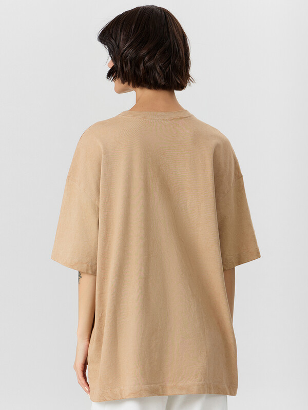 Футболка силуэта оверсайз из трикотажного полотна кулирка. Горловина круглой формы, обтачка горловины из рибаны. Шов горловины спинки закрыт бейкой из основного полотна.